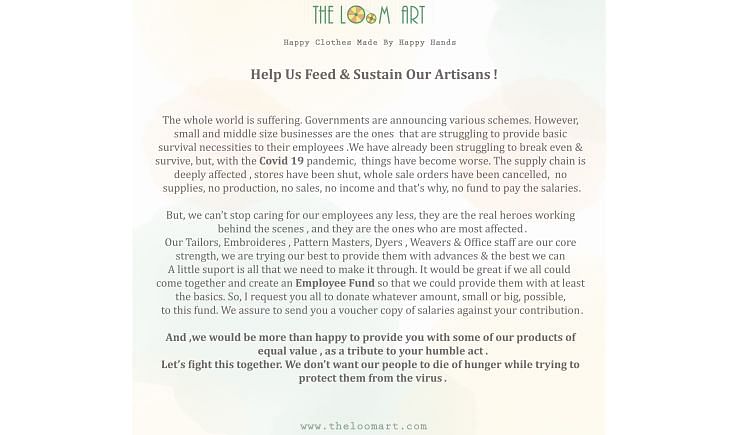 Due to an extended lock down every store, production & buying units are shut. No supplies, no production, no sales, no income and that’s why, we are struggling to provide basic necessities and salaries to our employees & artisans.